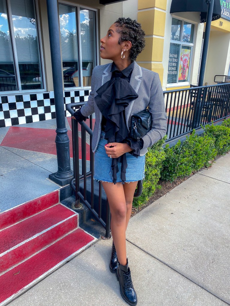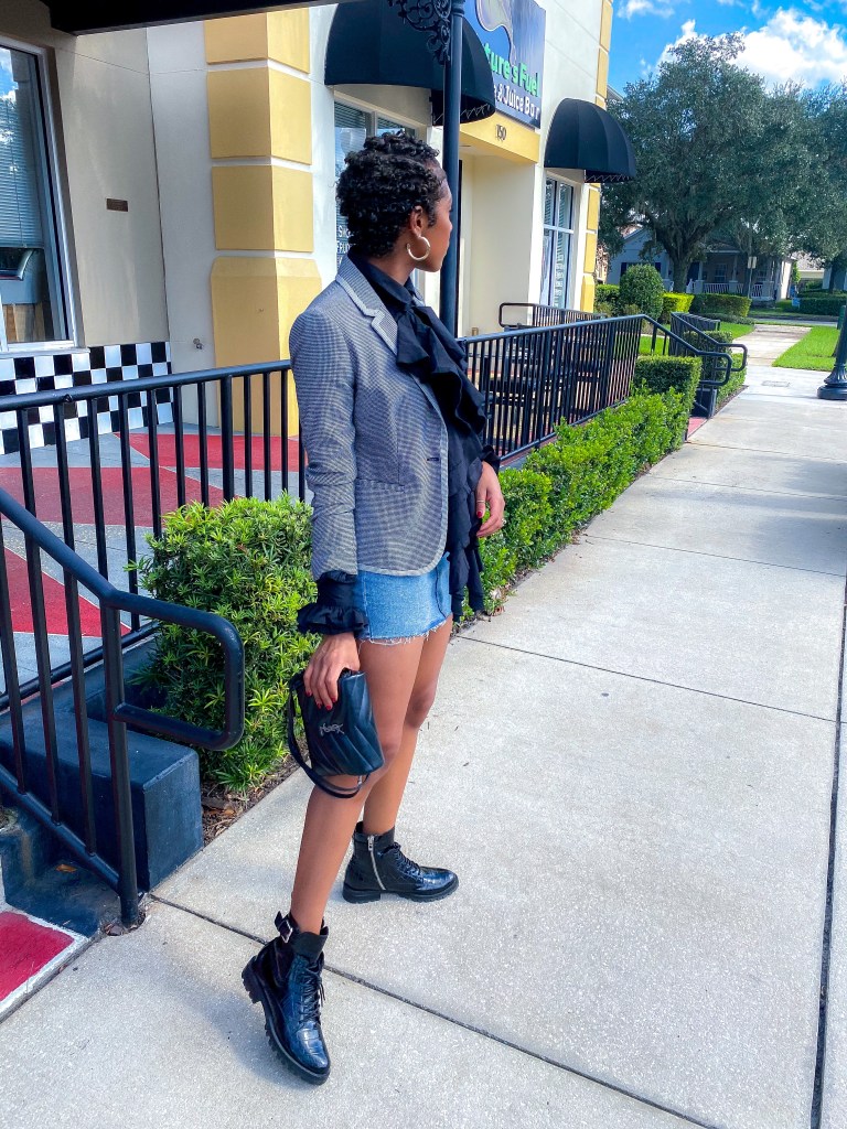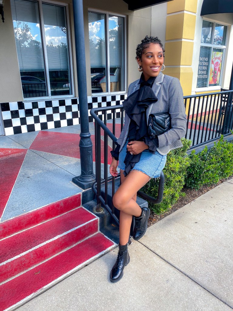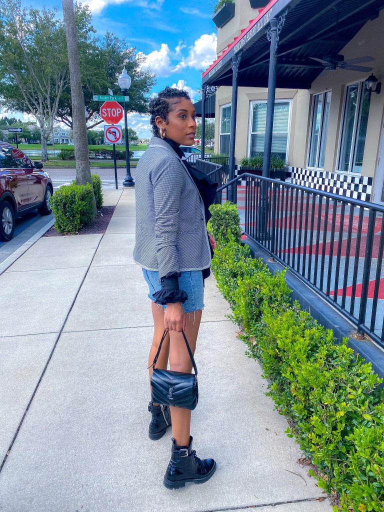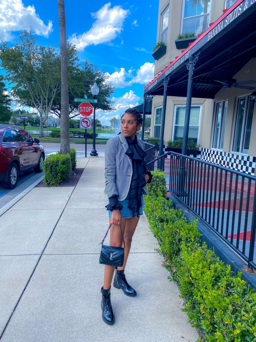 I’ve always been such a fan of looks that pull together both girl and tomboy chic and I feel that’s exactly what this look does! This blouse was purchased back in 2018 and I love everything about the ruffled neck line! I decided to pair it with a frayed hem denim skirt from Target, my tweed blazer from Banana Republic and of course my most favorite new shoes- these Dolce Vita Combat boots! I tied the look together with my YSL Lou Lou Toy bag and some gold hoops!