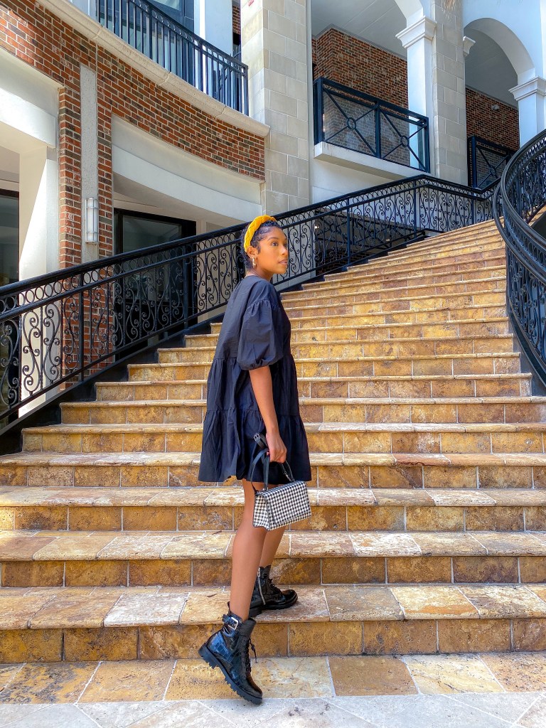 This look screams effortless chic to me – I mean it’s composed of 4 things ; a dress (loose fitting which allows for movement, combats boots ; I love the juxtaposition of a dress with a combat boot, a smaller bag and a headband! From galavanting around a new city to brunch with a group of friends and really anything in between this is a combination that never fails.