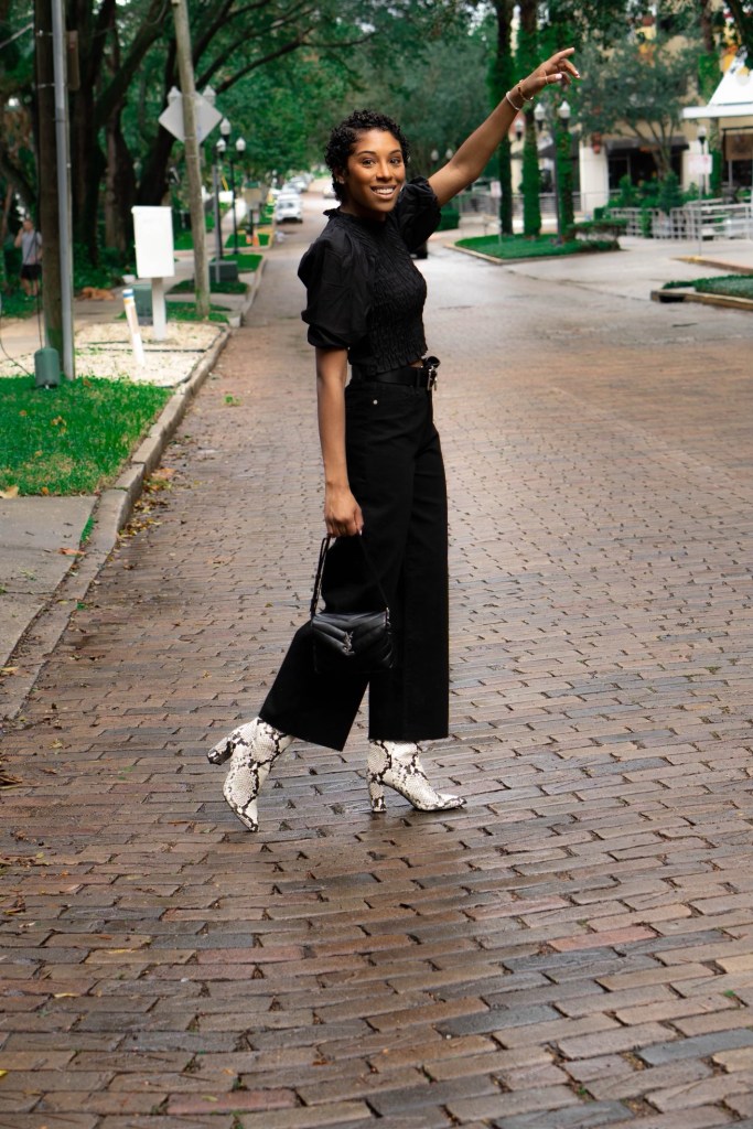 I added a little pizazz with my snakeskin boots for a ” I threw my sneakers off from the day and slipped into my boots for Happy Hour” look but you can really pair this look with any show you’d like! A pump, a Boot, a Sneaker, even a sandal. Chic and Classic!