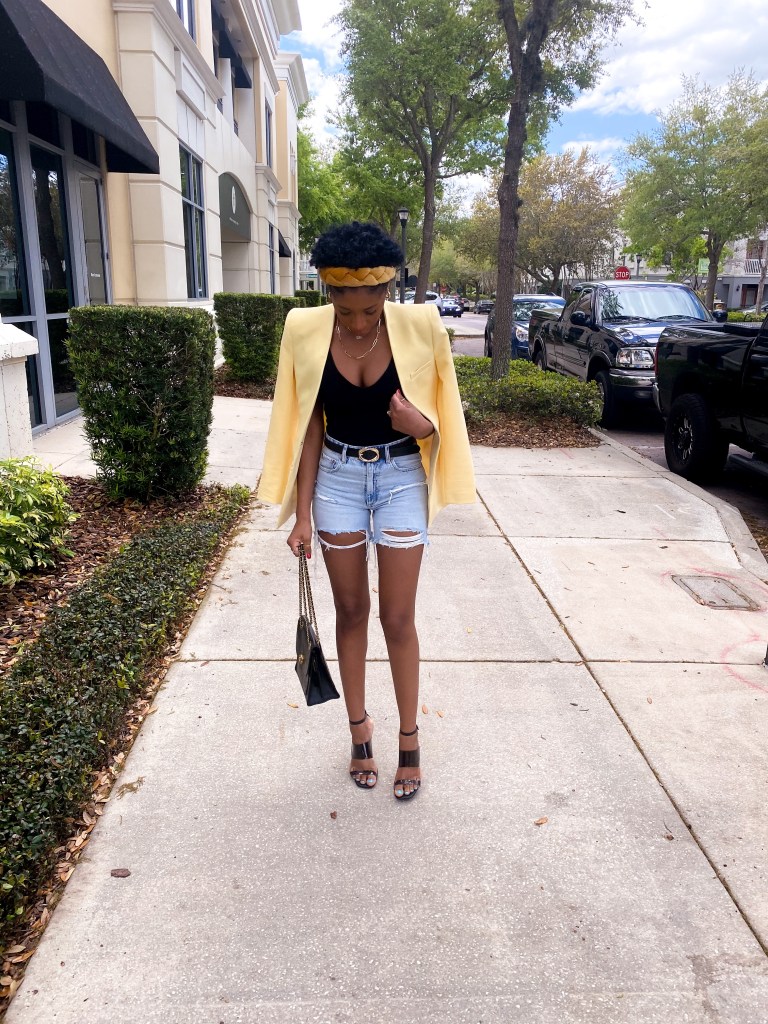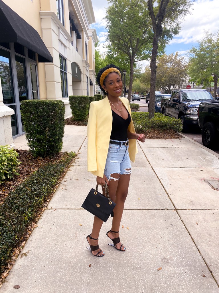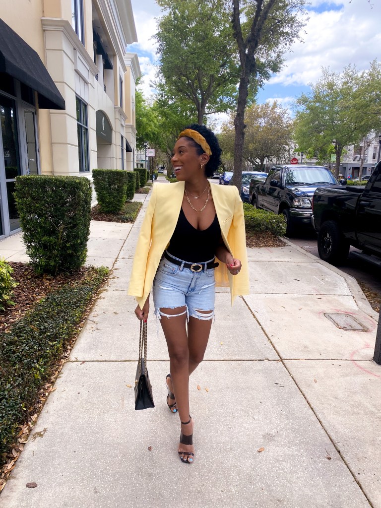 I’ve always found myself steering clear of blazers (I’ve never really had more than 2 or 3 in my wardrobe) and have recently been bit by the blazer bug! Without this yellow blazer I’m just wearing distressed denim shorts and a black bodysuit but when I throw the blazer over my shoulders the look is instantly elevated and I’m suddenly meeting the girls for Happy Hour – hello Lychee Martini! I’ve paired this look with some fun BaubleBar accessories and the most perfect Amazon gold hoops, my ShoeDazzle black wedges and my favorite yellow braided headband!
