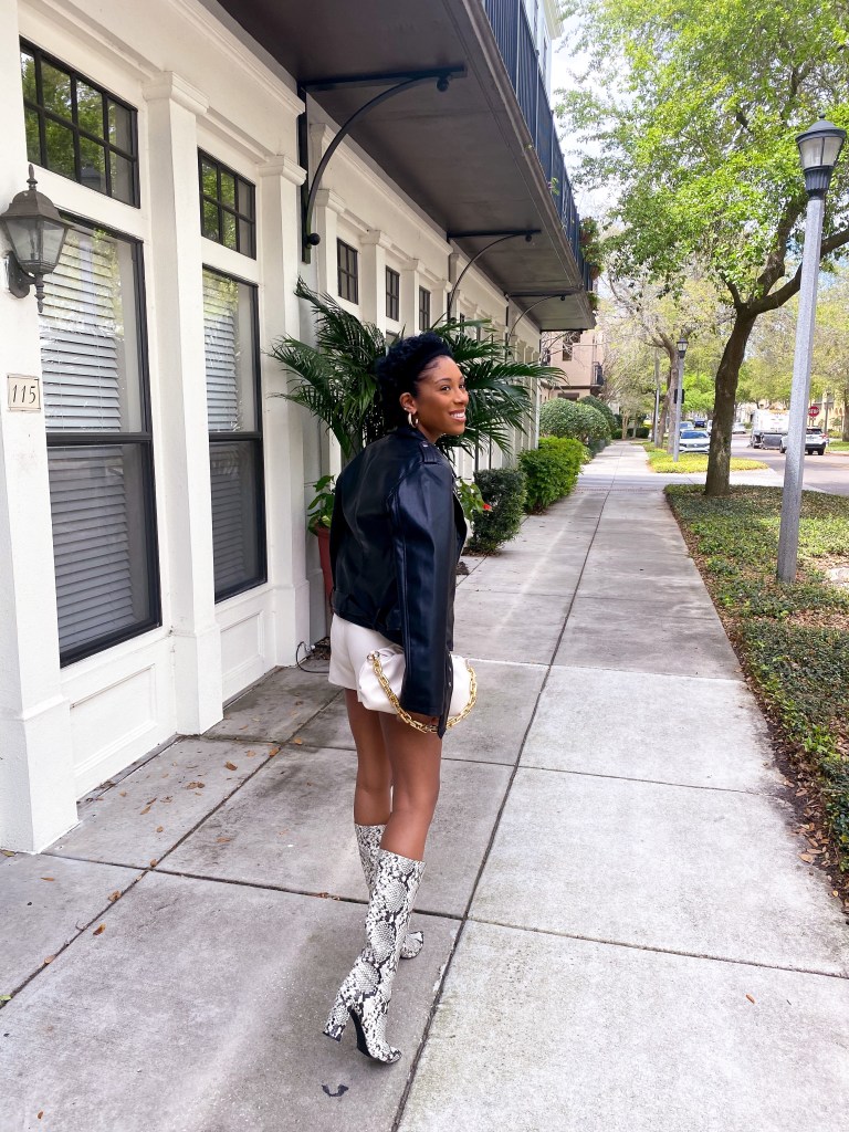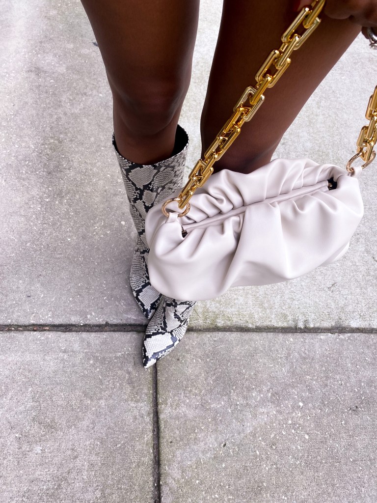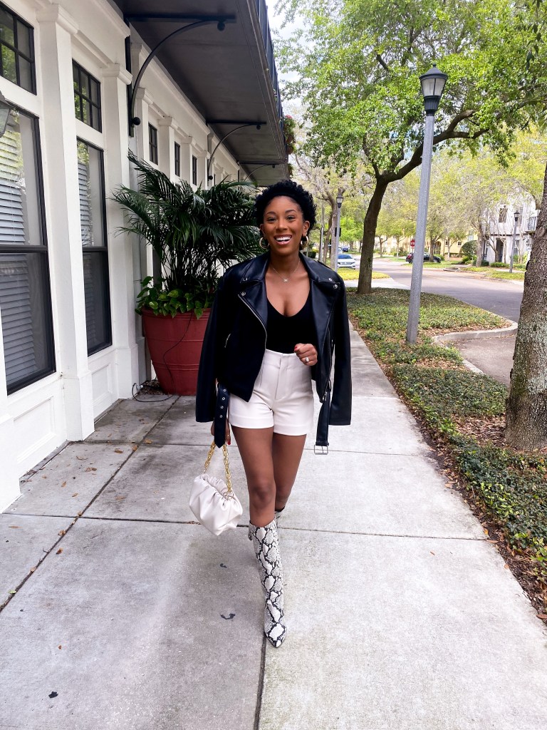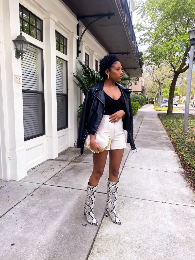 First off I’ve been living in this fitted v neck black bodysuit ( I need it in so many more colors) and decided to pair it with these front pleated high waist nude shorts from Zara (see similar linked above) and a leather jacket of course draped over the shoulders. For accessories I added a larger gold hoop, my newest handbag- the Bottega Veneta Chain Pouch Dupe I reviewed on my Youtube here and of course these knee high snakeskin boots!