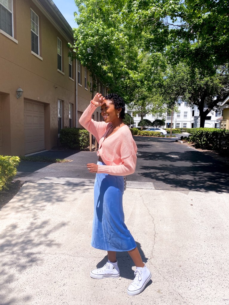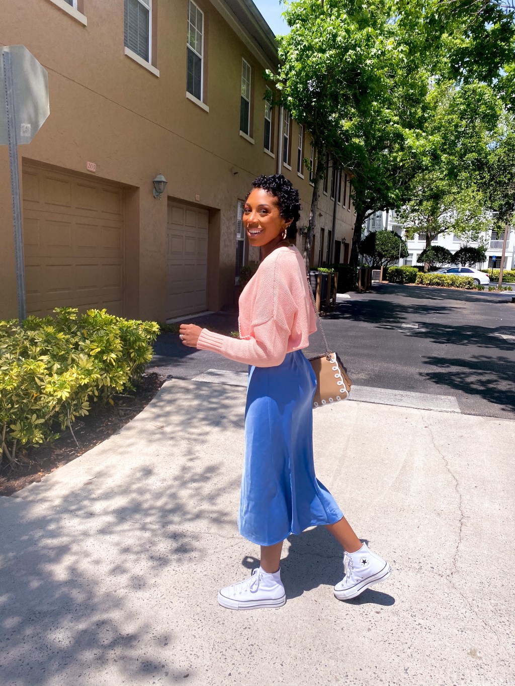 When I think of Spring I most certainly think of pastel colors and this peach pink sweater is the most perfect! Especially paired with the blue satin midi skirt. Hanging out with m little sister a few weeks back I just had to snap some photos of this cotton candy color combo! I opted for my newest and most beloved sneaker, the platform high top converse and we ran around Orlando all day long!