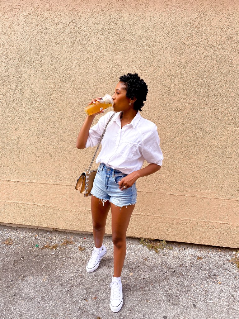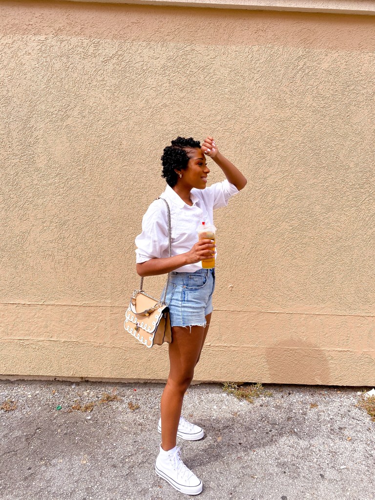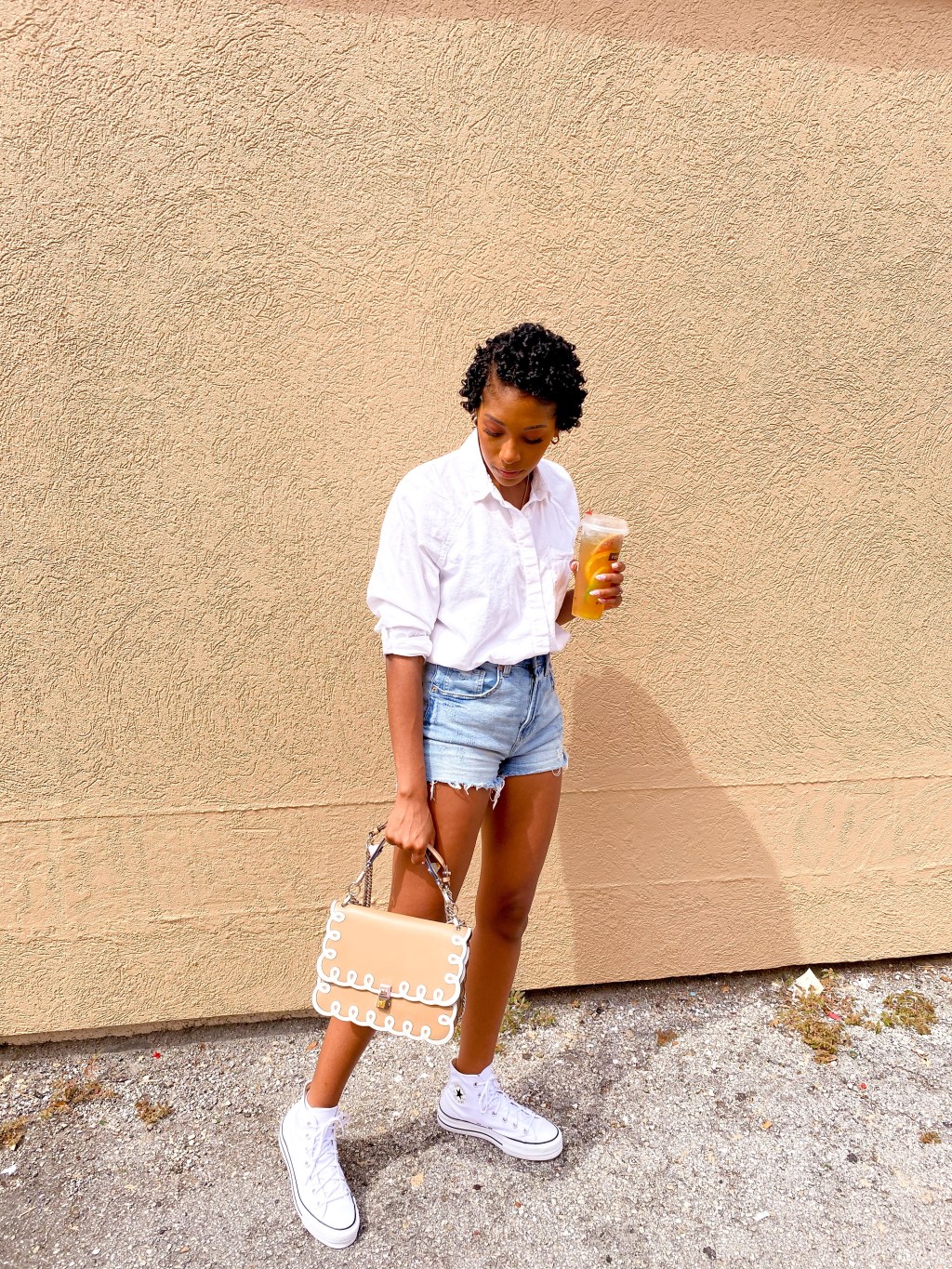 There’s something so simple about a white button own when paired with denim (in any form). With it being Spring I am finding myself in denim shorts a lot and love how the simple white button down looks when paired with the shorts! I’ve paid the entire look it my newest handbag and my platform converse. Perfect for Boba Tea dates with my little sister!