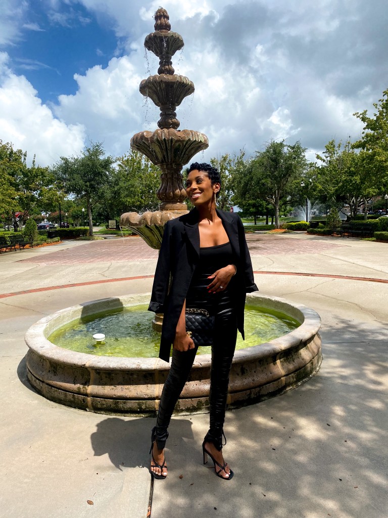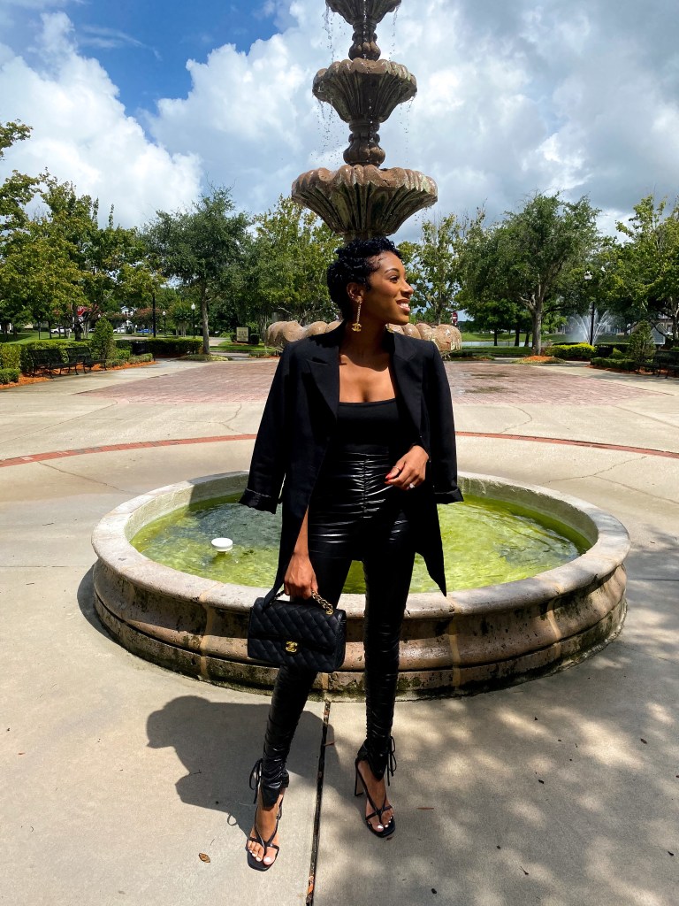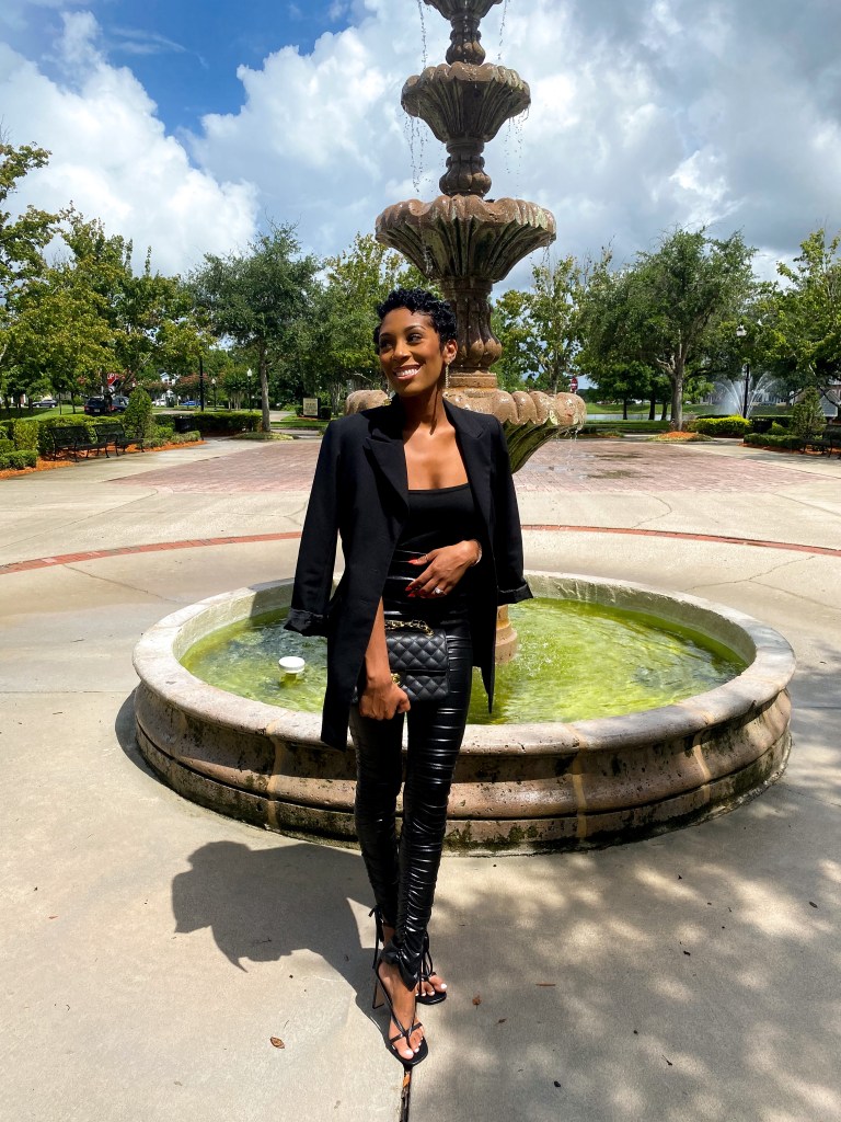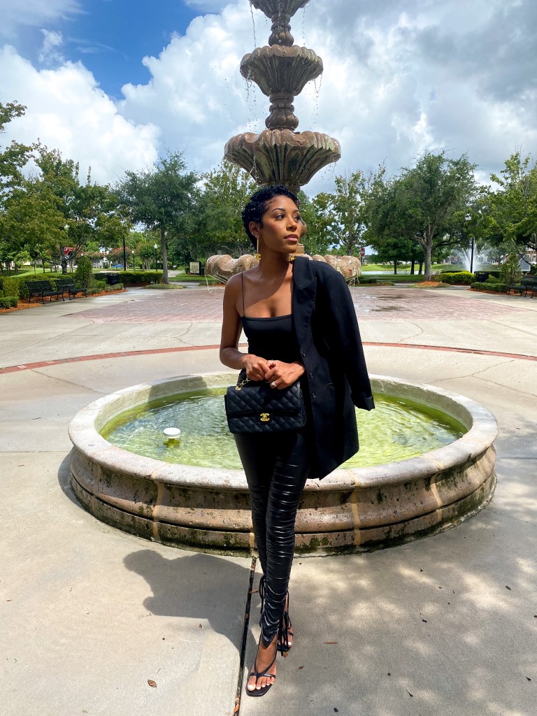 Whenever I don’t know what to wear this is my uniform, a black leather pant paired with a black bodysuit! I always throw my favorite black blazer over my shoulders and a good black shoe! It’s a quick and easy look and always so chic!