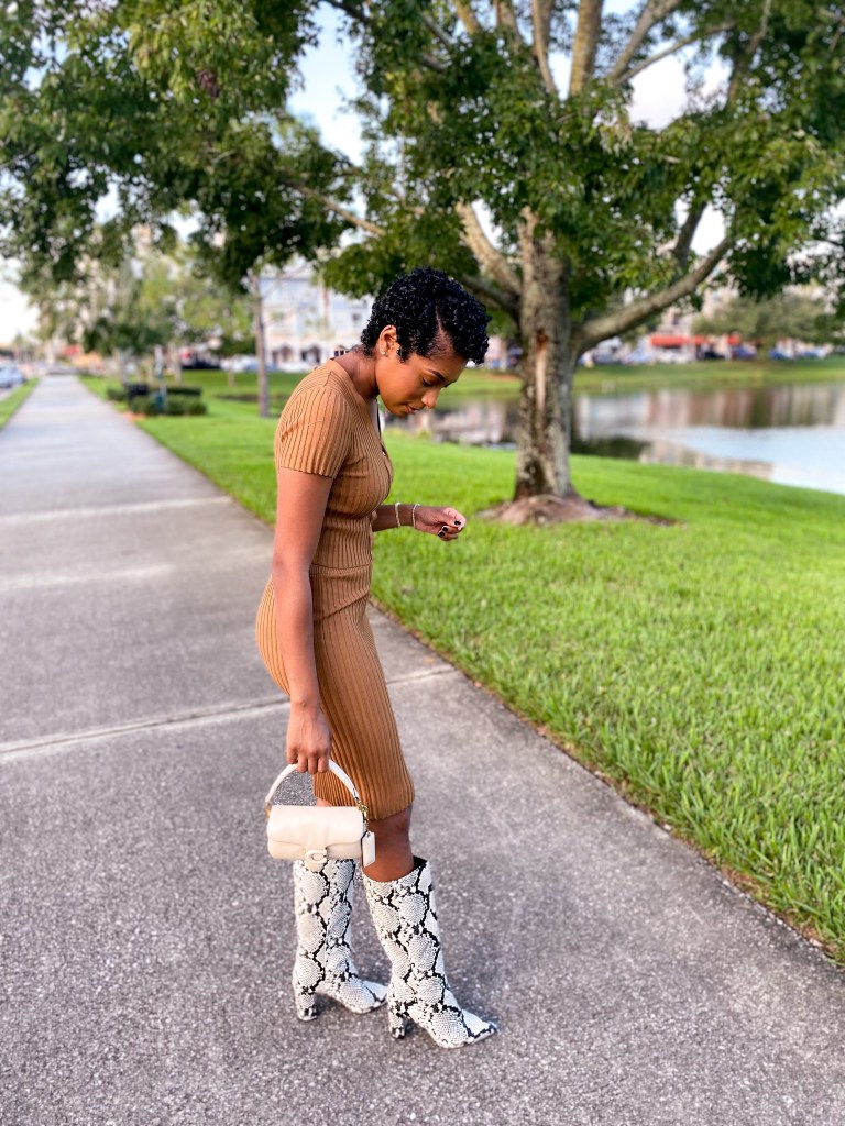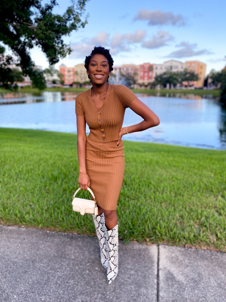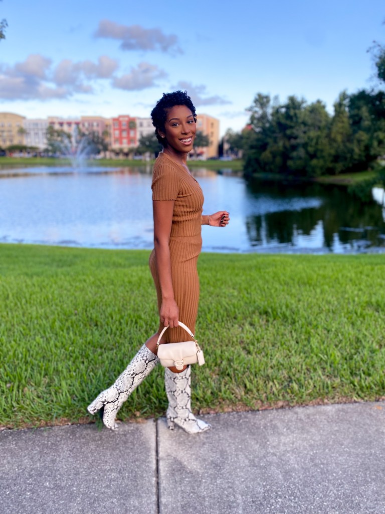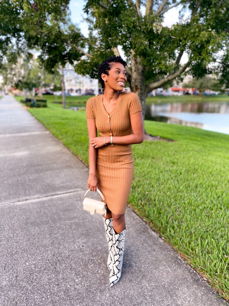 I love this look for Fall in Florida because it still gives me a dreamy Fall color palette and a way to wear with boots all the while still being practical for a warmer day in Orlando. Are you excited for Fall looks?