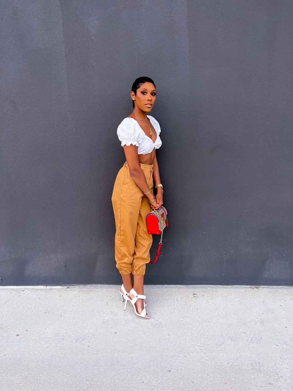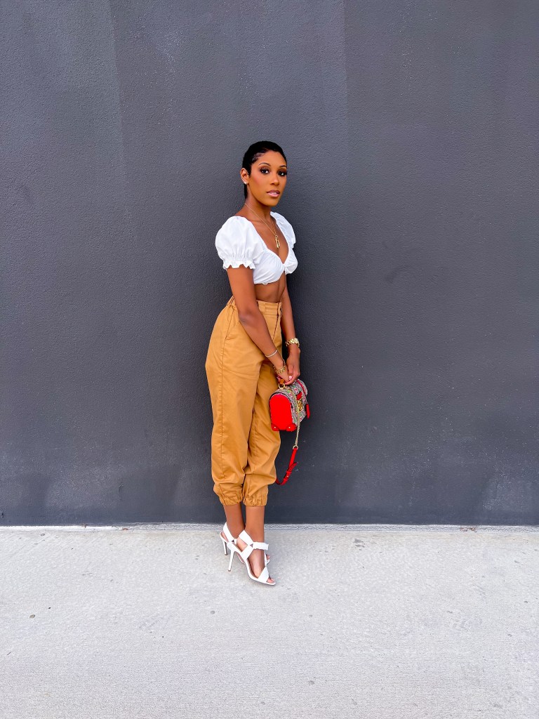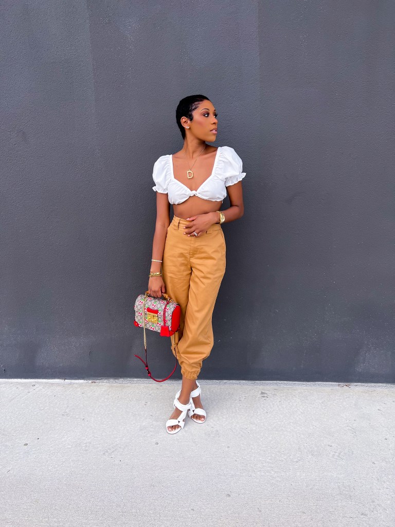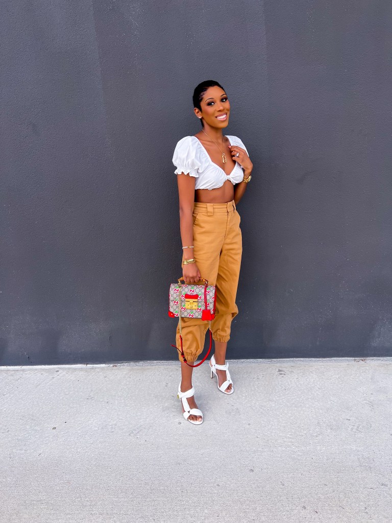 One thing I love almost more than anything (but not quite) is Spring weather. It’s not too hot but the skies are always blue, the sun is almost always shining and the vibe is just happy! I live for putting together outfits, especially ones for Spring and I think this edgy yet super simple look might be one of my best ones yet! I paired these Shoedazzle Cargo Pants with this White very cropped Shein top that I had purchased for my trip to Vegas last year – very Vegas appropriate! The look called for a simple but edgy shoe and ShoeDazzle did just that when creating the Gamora Strappy Sandal – the white was the perfect addition to the simple look. For an extra edge I grabbed my Gucci Apple Bamboo bag and everyone’s favorite Bamboo Initial Necklace!