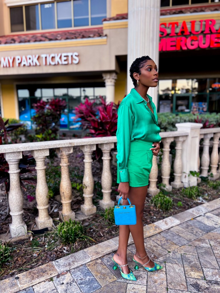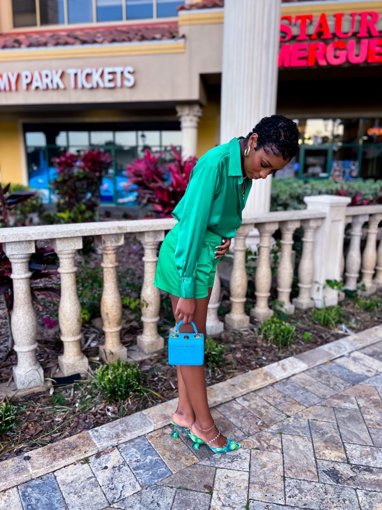 Date Night in Summer ALWAYS calls for color and when I saw these Shoedazzle mules I knew I had to style them up with green and blue! I paired the mules with satin Green shorts and a satin Green button up blouse both purchased from Zara! Gotta love Zara. I opted for gold jewelry – my favorite BaubleBar hoops and my new bright blue Terry cloth Brandon Blackwood Box bag! The colors were so complimentary of each other and the look was perfect for a Date Night out on the town!