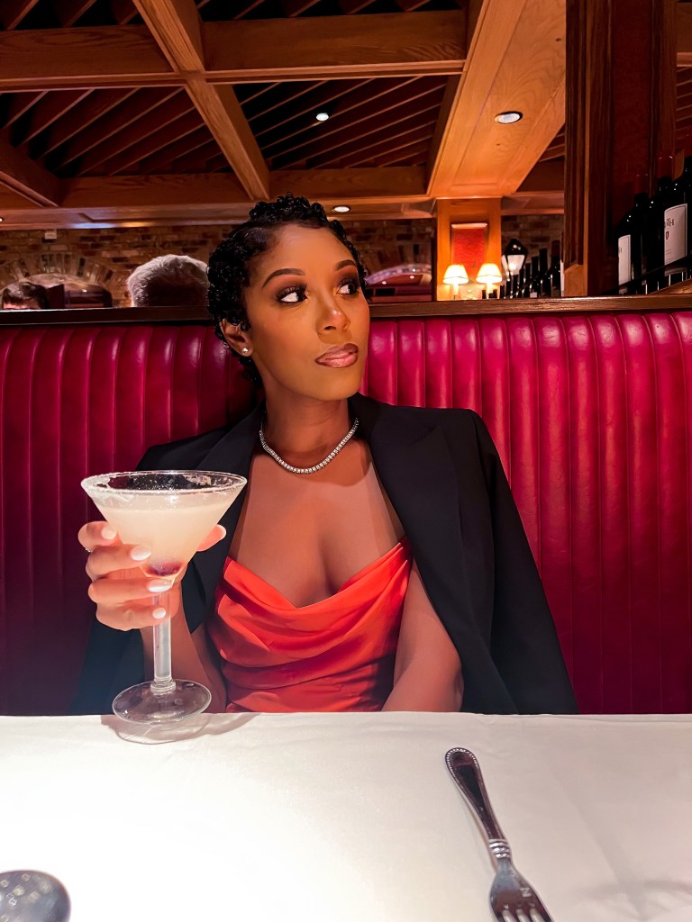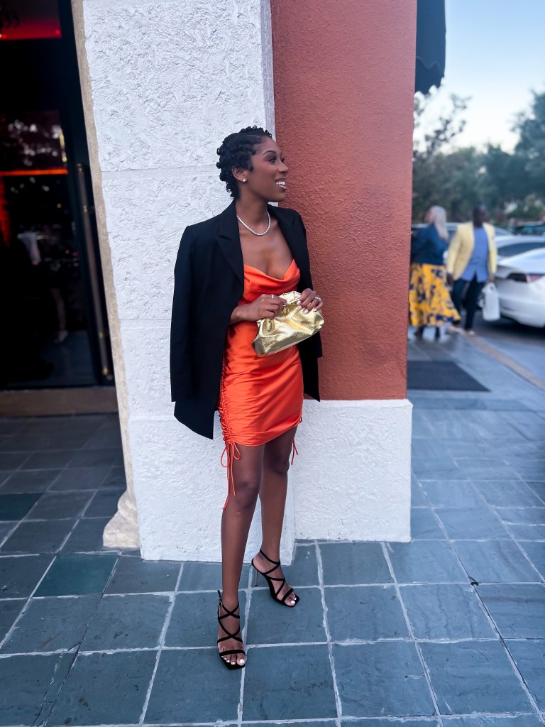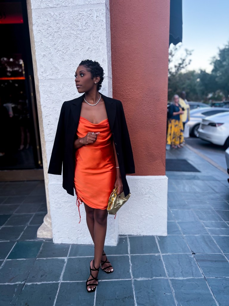 A few weeks back my husband turned 40 and to celebrate I took him to dinner here in Orlando before heading to the Improv to enjoy a comedy show! I wanted to wear something a little sexy, something that would keep my arms warm during the show and a pop of color (it is still Summer after all). I opted for this Orange, slinky satin dress I picked up during the Zara sale for $12 and paired it with my go to Pretty Little Thing Black blazer, my ShoeDazzle black and Gold heels (which are a great dupe for the Tom Ford Lock Heels) and this little gold dumpling bag I grabbed from Shein last Summer!