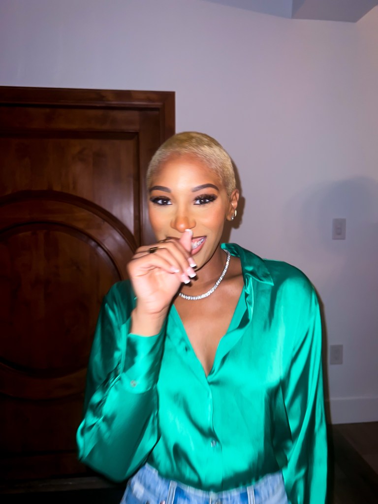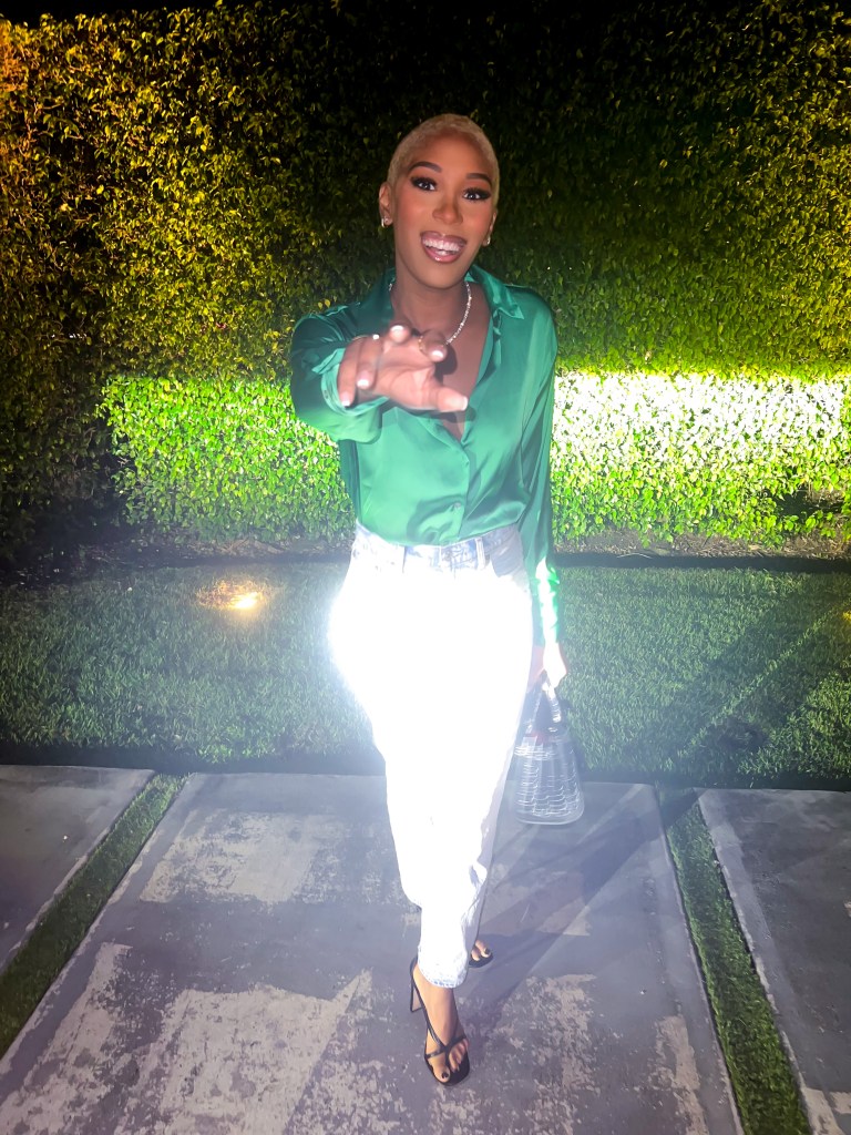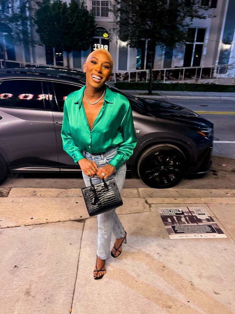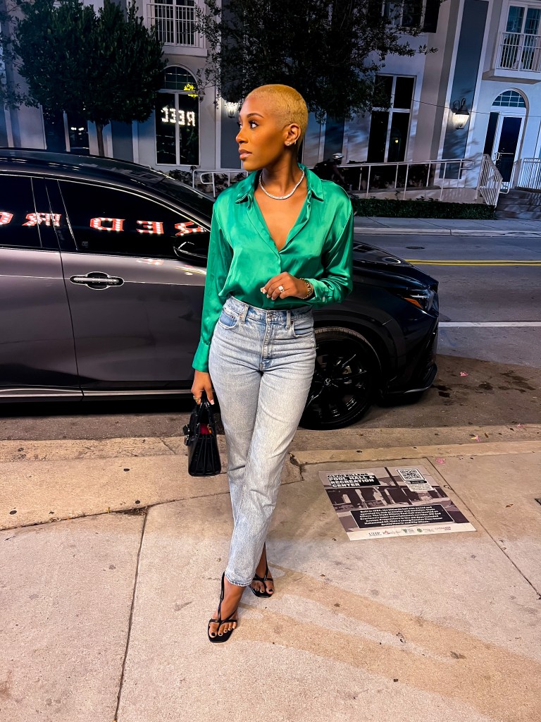 Let’s get into the outfit though. Having freshly shaved my head (yet again!) AND being ice blonde or at least on the journey I opted for this Green silk blouse from Zara but to keep it casual I paired it with my favorite Abercrombie and Fitch Jeans, the ShoeDazzle Jaxin heel in black and my Saint Laurent Nano Sac De Jour bag.