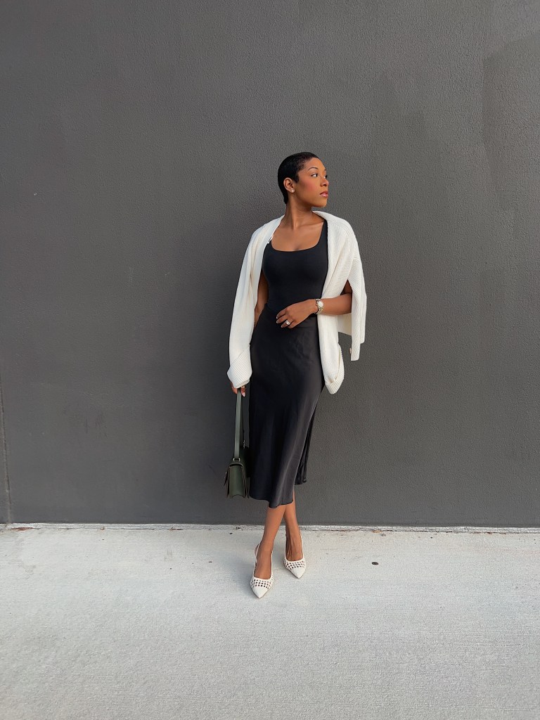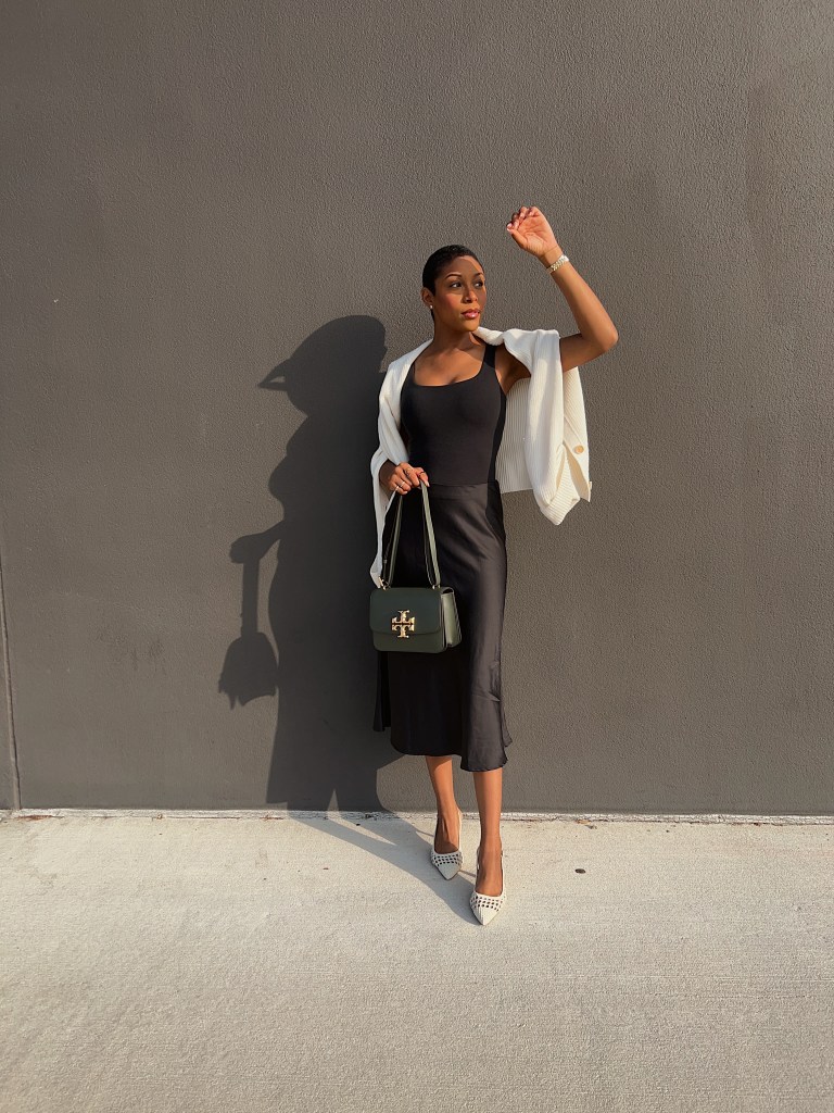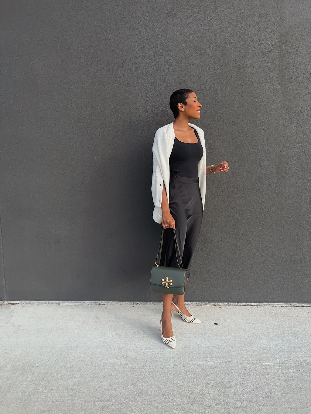 When it comes to going into the office I like to keep it simple yet classy! A few weeks back I picked up the most gorgeous basket weave slingback kitten heel from ShoeDazzle and immediately knew what to pair them with. I opted for a black satin midi skirt paired with a simple black fitted tank! I threw an oversized bell sleeved cardigan over my shoulders and grabbed my favorite Tory Burch bag ( wish I had this bag in the cream and black as well!) and that was the look!
