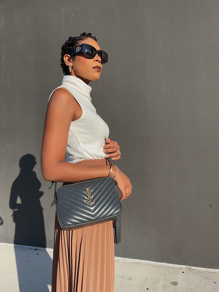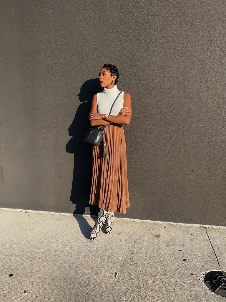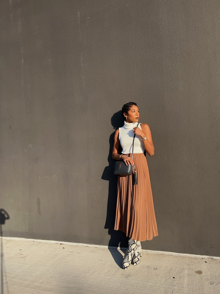 Today I opted for this neutral look with a high waisted, pleated midi skirt paired with my sleeveless cream turtleneck from Banana Republic. I finished the look with my favorite knee high snakeskin boots from Macys and a few accessories, it’s definitely giving Florida girl fall!