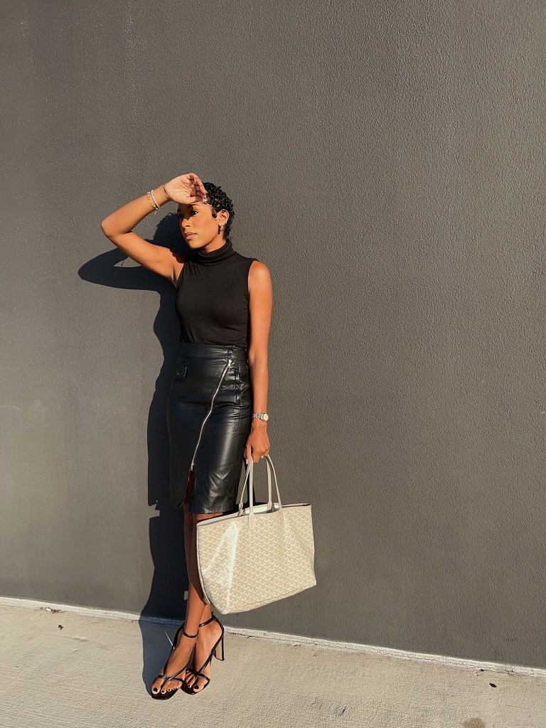 I love a monochromatic moment and all black is no exception! I purchased this skirt from ShoeDazzle back in 2021 and have been rocking it ever since! I paired it with a sleeveless turtleneck from Banana Republic, my Jaxin heels in black from ShoeDazzle and my grey Goyard tote! It’s giving come to my office for a meeting!