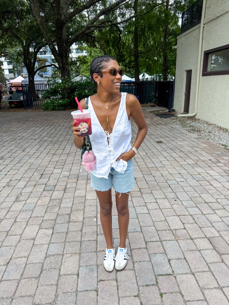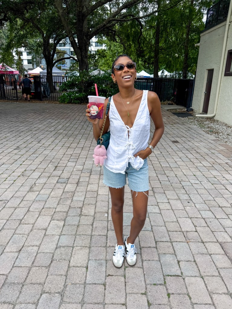 With temperatures here in Orlando surpassing the 90’s lately, I threw on my go-to Summer Uniform – light denim shorts, a breezy white linen top (love the tie-front detail) and my classic Adidas Sambas. Keeping it forever comfortable and cute in this Florida heat! This look is so effortless but still pulled together with some layered gold jewelry and some simple sunnies!