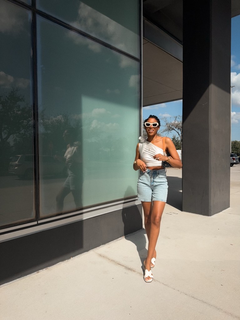 I paired the top with classic high-waisted denim shorts—an absolute summer staple and from Abercrombie and Fitch. The light wash keeps it casual and cool, but the clean cut makes the whole look feel polished. If you’re building a capsule wardrobe for summer, this type of short is a non-negotiable.