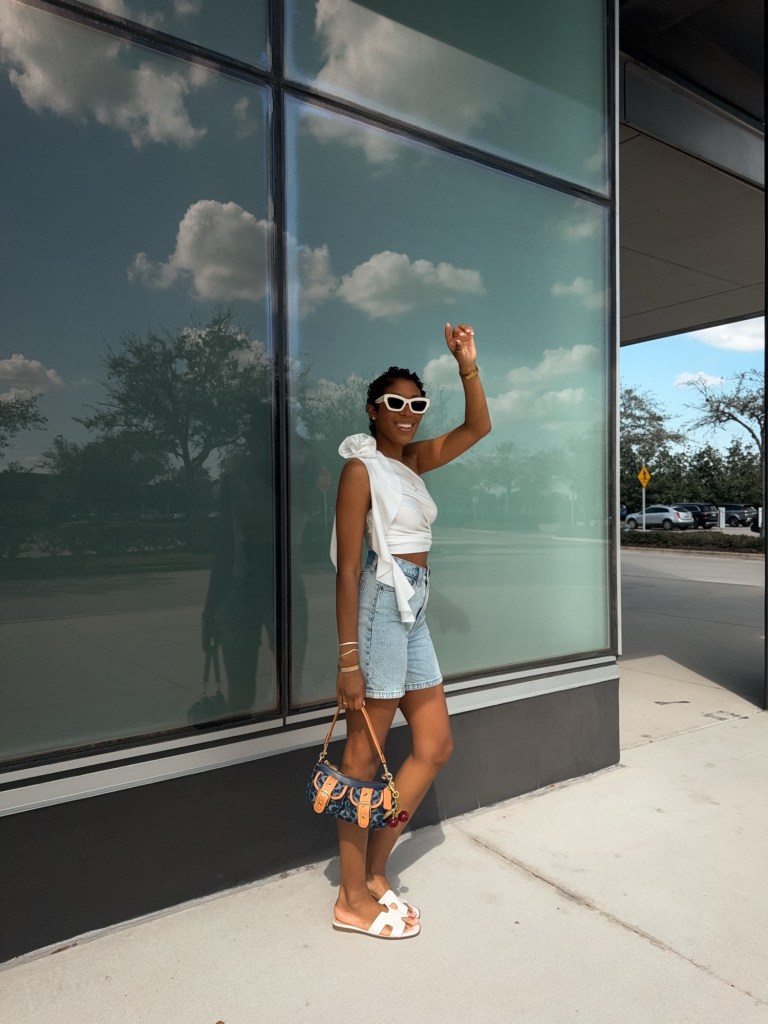 The white slide sandals keep everything grounded and comfortable (because style shouldn’t have to mean sore feet), and I love how they echo the top’s color and clean vibe. I added structured white sunglasses for a bit of retro glam and a mini printed bag to introduce a pop of color and texture.