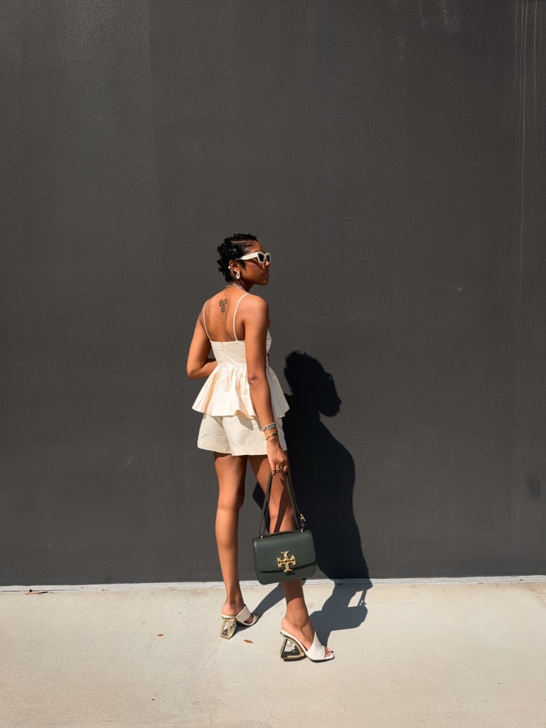 Play with silhouettes: A peplum top adds shape and interest without overcomplicating the look. Mix textures: Matte shorts, shiny fabric, smooth leather accessories—this helps the outfit feel rich and layered. Add contrast: A black or dark green handbag breaks up the monochrome and adds depth.