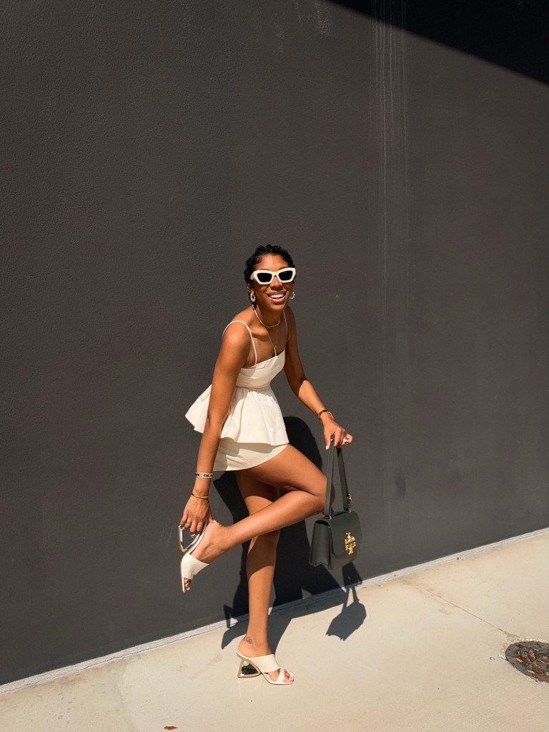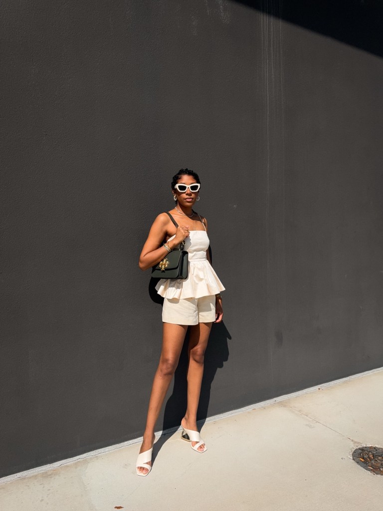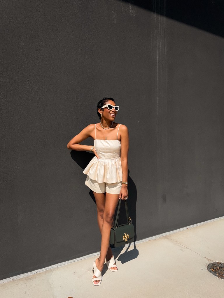 I styled this light neutral peplum top from the Antonio Melani x The Style Bungalow collaboration for Dillard’s and high-waisted shorts from Zara for a sleek, feminine silhouette that still feels relaxed. The subtle sheen of the fabric catches the sun in all the right ways, making it a perfect choice for golden hour photos and warm-weather outings. Whether you’re heading to a rooftop lunch or a casual summer event, this is one look you’ll keep reaching for.