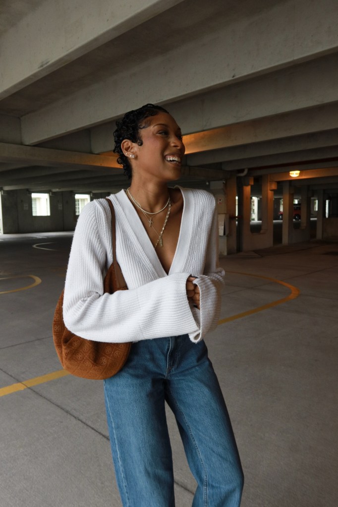 There’s something about early fall that calls for effortless, cozy chic — when it’s cool enough for a cardigan but warm enough to show a little skin. This weekend’s brunch look captured exactly that balance.