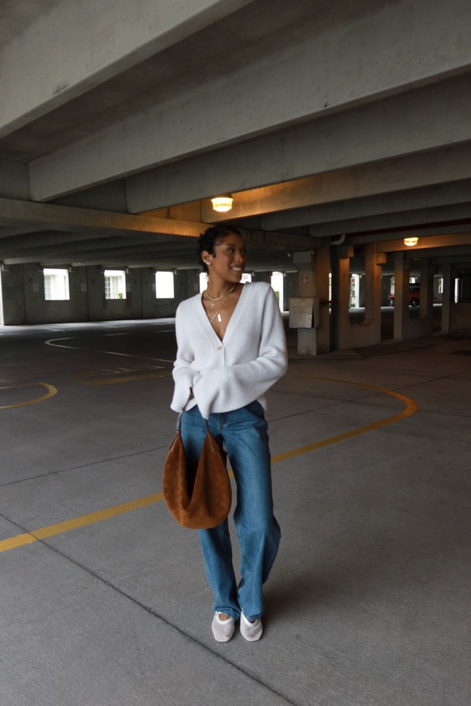 For accessories, I brought out my Tory Burch balloon bag — a true fall staple in my wardrobe. The warm tone complements everything from cream knits to denim blues, and the shape adds just the right amount of structure to an otherwise relaxed look.