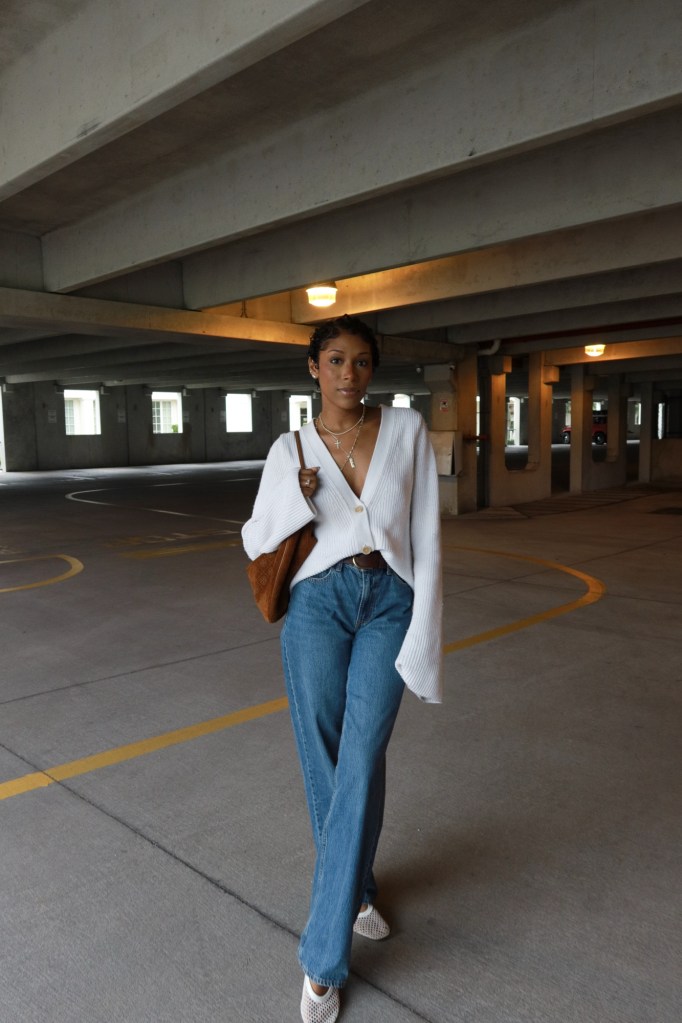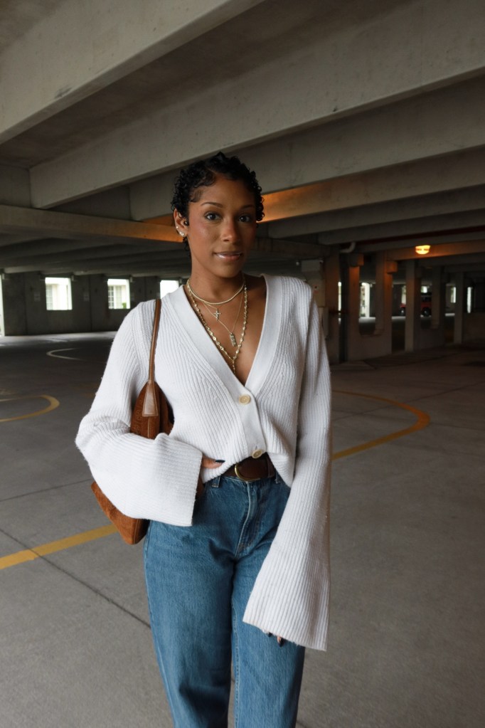 I paired them with a cream cardigan from Banana Republic Factory, slightly oversized and soft enough to wear on repeat all season. I love styling cardigans buttoned low like this — it’s casual but still feminine, and it layers beautifully over a simple bralette or tank.